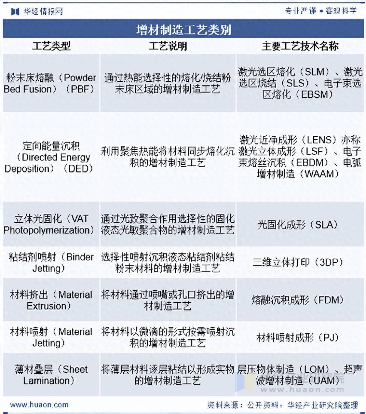 增材制造又称“3D打印”,通过使用计算机辅助设计三维模型数据,将离散材料(液体、粉末、丝、片、板等)以分层制造、逐层堆叠的方法创建物理对象的技术。增材制造发展至今,目前处于多技术路线共存的状态。根据ISO/ASTM52900-15和国标《增材制造术语》(GB/T35351-2017),增材制造工艺可分为七大基本类别,每一工艺类别分别衍生出不同的细分工艺技术,具体如下: